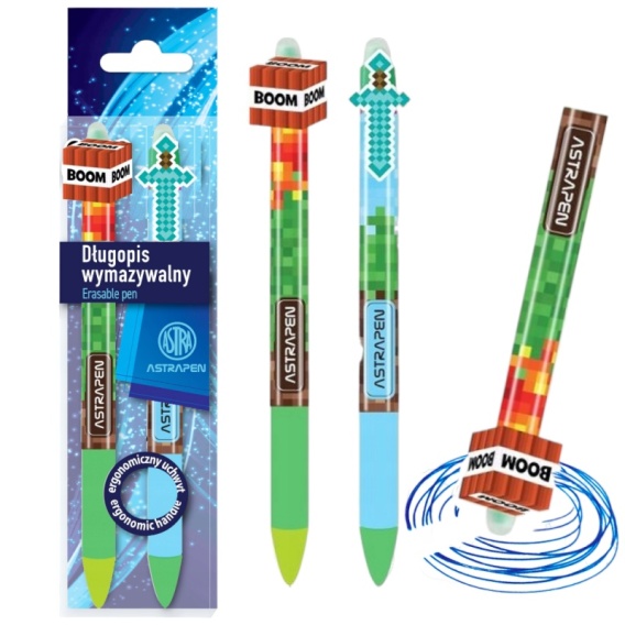 Długopis wymazywalny Astrapen Oops! posiada wkład z zaawansowanym technologicznie tuszem, umożliwiającym wymazanie wszystkiego, co zostało nim napisane. Zrobisz to dzięki specjalnym gumkom w kształcie pikselowych główek, które skradną serce każdego fana gamingu. Ergonomiczny uchwyt zapewnia wyjątkową lekkość pisania. Długopis wymazywalny znajdzie zastosowanie w różnych sytuacjach - w szkole, pracy, podczas notowania czy planowania wakacyjnych wyjazdów. Możesz go również wykorzystać do zabawy, rysowania czy tworzenia szkiców. Pisz, zmazuj - baw się!