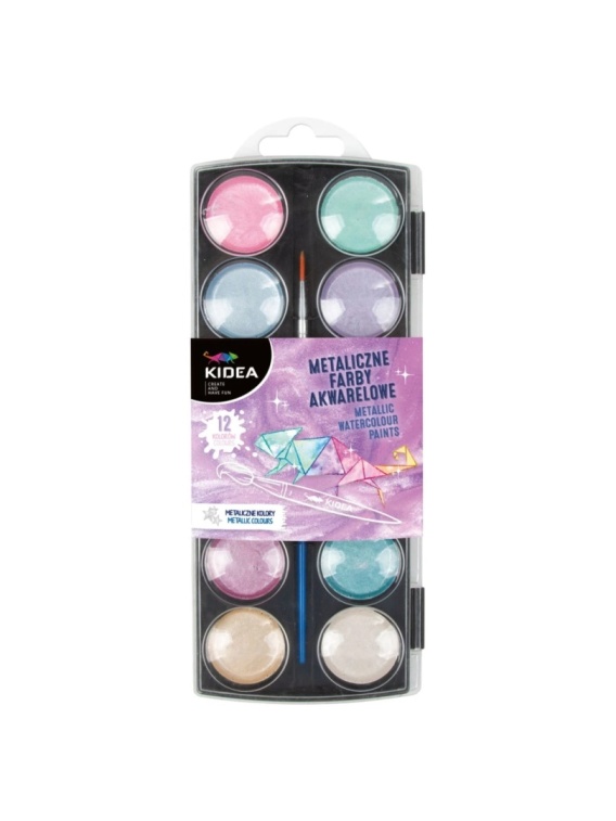 Farby akwarelowe wodne 12 kolorów metalicze z pędzelkiem KIDEA