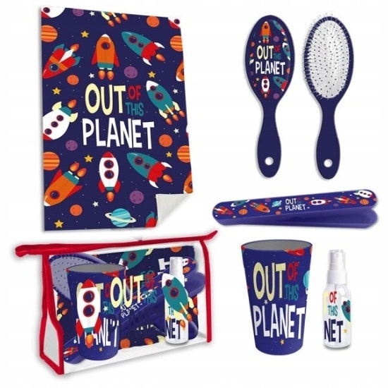 Kosmetyczka dziecięca szczotka do włosów ręcznik kubek Kosmos rakiety