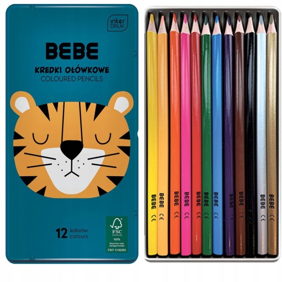 Kredki ołówkowe trójkątne w metalowym pudełku 12 kolorów TYGRYS