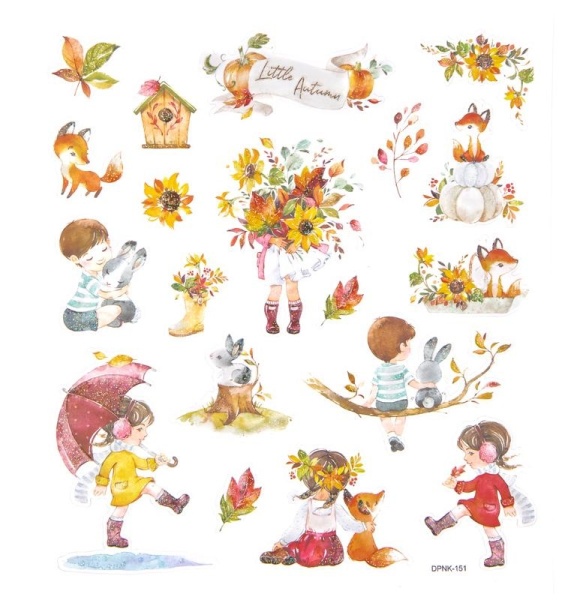 Naklejki z brokatem jesienne kwiaty i liście, dzieci w kaloszach z parasolem 19 szt