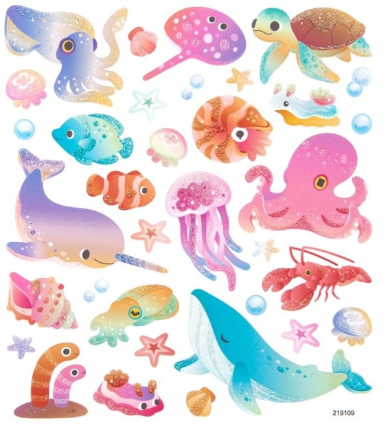 Naklejki z brokatem - zwierzęta morskie, ryby, rozgwiazdy,ośmiornica 34 szt.