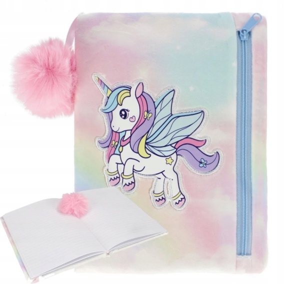 Notes pamiętnik pluszowy tęczowy jednorożec z piórnikiem saszetka