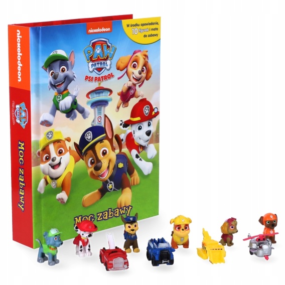 Psi Patrol Moc zabawy w zestawie teczka - książka wykonana z twardej tektury a w niej ilustrowane opowiadanie na 10 stronach, mata do zabawy o wymiarach 60 x 90 cm oraz 10 figurek o wymiarach 4-6 cm.