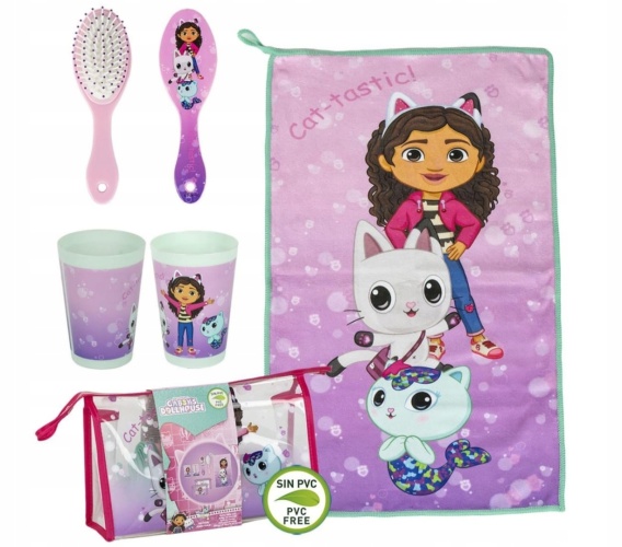 Zestaw kosmetyczka szczotka do włosów ręcznik kubek KOCI DOMEK GABI